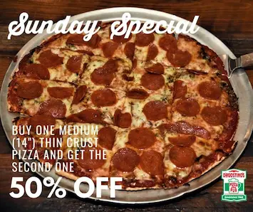 Enjoy our Sunday Special! Buy one medium thin-crust pizza and get the second one at 50% off. Perfect for sharing and saving!